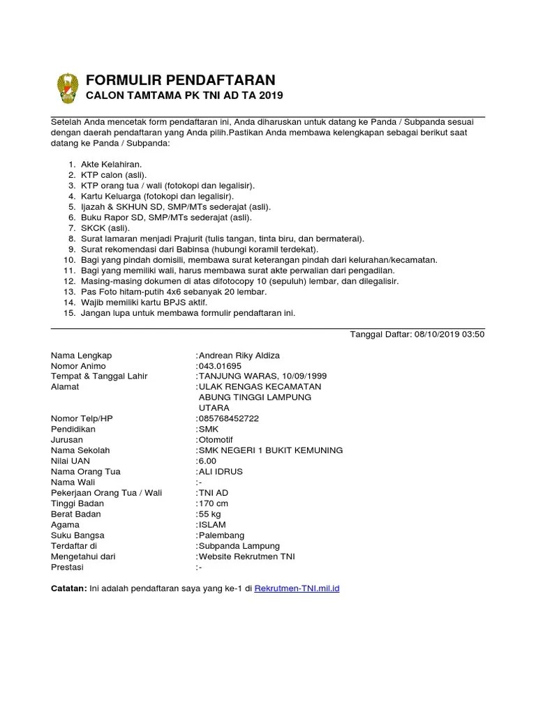 Contoh surat lamaran calon bintara tni ad. Download contoh surat lamaran masuk tni ad contoh miri. Bagi calon hakim peradilan umum agama tata usaha negara yang dinyatakan lulus ujian tertulis selanjutnya mengikuti tes psikotest wawancara dan membaca kitab bagi calon hakim peradilan agama dan diwajibkan membawa surat keterangan bebas narkoba dari rumah sakit pemerintah setempat pada saat mengikuti tes wawancara dan psikotest. Harus ada surat persetujuan orang tua/wali dan selama proses penerimaan prajurit tni ad tidak melakukan intervensi terhadap panitia penerimaan maupun penyelenggara pendidikan pertama dalam bentuk apa pun, kapan pun dan di. The collection that comprising chosen picture and the best amongst others.