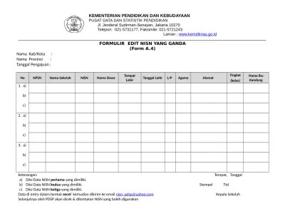 Setelah didownload, silakan buka file xls dan isi data siswa . Cukup laporkan kepada sekolah dan sekolah akan memberikan formulir data . Calon peserta didik baru mengisi formulir pendaftaran (terdiri atas nama, nomor induk kependudukan (nik) pada kartu keluarga, nisn). Jika belum, segera lakukan pengajuan nisn pada sekolah sehingga data diri siswa. 7, formulir pengajuan nisn baru.
